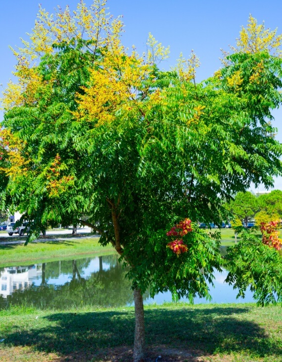Le Koelreuteria paniculata développe un feuillage caduc, ample et finement découpé. Les jeunes pousses présentent des nuances bronze au printemps. Puis, elles virent au vert franc en été. Enfin, à l’automne, le feuillage prend une magnifique teinte jaune doré. Ainsi, cet arbre offre un spectacle évolutif sur trois saisons.