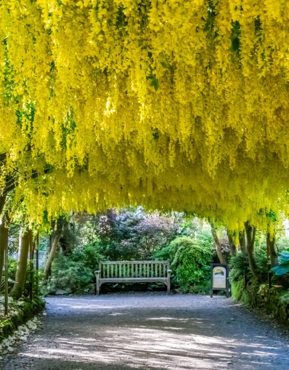 Tout d’abord, le Laburnum x watereri Vossii produit en mai et juin des grappes pendantes pouvant atteindre 50 à 60 cm de longueur. Ces fleurs papilionacées jaune d’or forment de véritables rideaux lumineux. Contrairement au cytise commun, cette variété offre une floraison plus dense et plus régulière. Ainsi, il crée un effet de pluie d’or spectaculaire, idéal en sujet isolé ou en tonnelle.