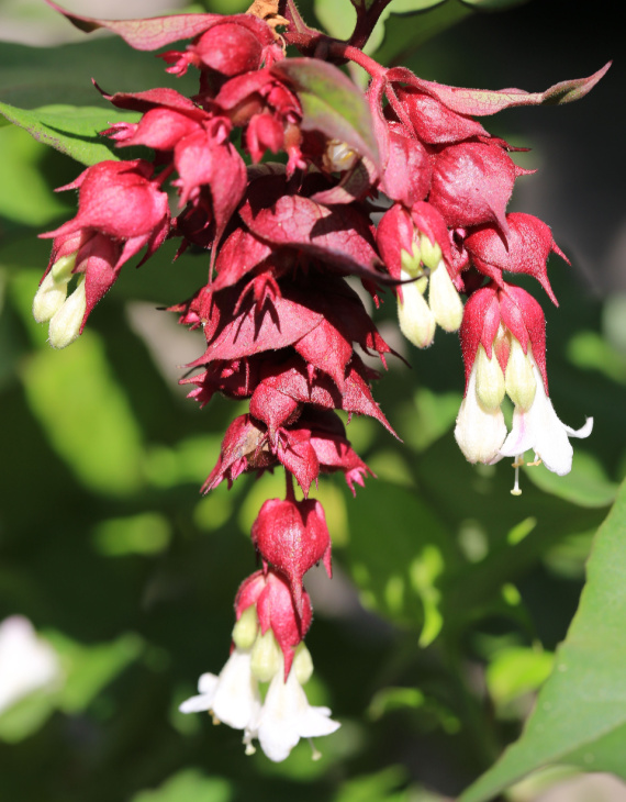De juillet à septembre, cet arbuste se pare de longues grappes de fleurs tubulaires rouge-pourpré, entourées de bractées violacées. Ces fleurs nectarifères attirent de nombreux pollinisateurs, notamment les abeilles et les papillons, contribuant ainsi à la biodiversité du jardin. En fin d’été, elles donnent naissance à des baies noir violacé, particulièrement appréciées des oiseaux, qui prolongent l’intérêt décoratif du Leycesteria jusqu’à l’automne.