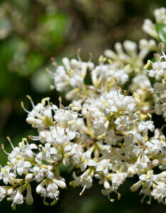 Au printemps et en été, le Troène du Texas produit de petites fleurs blanches en grappes coniques, légèrement parfumées, qui attirent les pollinisateurs. Après la floraison, il se pare de petites baies noires décoratives, très appréciées des oiseaux. Son feuillage coriace et brillant structure les massifs et enrichit les haies d’une belle texture.