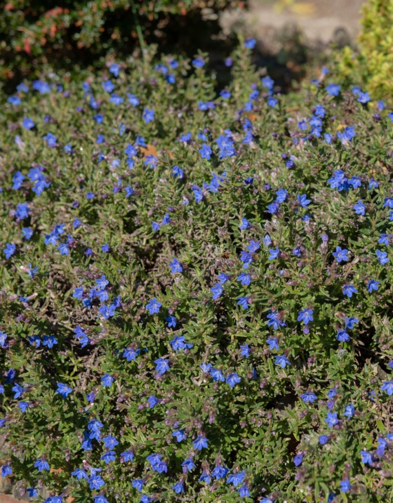 La Lithodora diffusa Heavenly Blue appartient à la famille des Boraginaceae. Ses feuilles étroites, lancéolées et légèrement duveteuses, forment un tapis dense de couleur vert foncé toute l’année. La floraison généreuse commence dès le printemps et se prolonge jusqu’au début de l’été. Chaque fleur est une étoile d’un bleu intense, presque lumineux, qui attire irrésistiblement le regard et les pollinisateurs.
