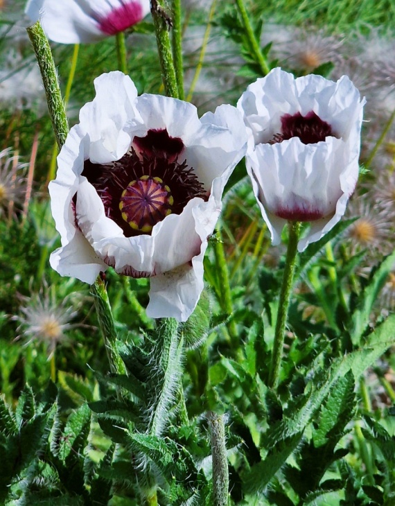 Le pavot d’Orient Royal Wedding se distingue par son port érigé et sa floraison imposante. Chaque tige florale, robuste et velue, porte une unique fleur chiffonnée, délicatement ondulée. Le cœur noir rehaussé de nombreuses étamines contraste avec les pétales blanc crème.