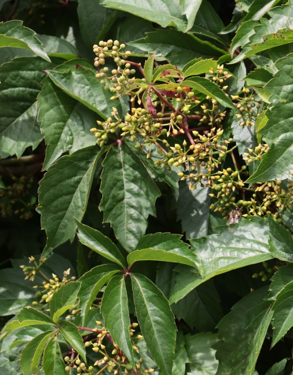 Le Parthenocissus quinquefolia se reconnaît à ses feuilles composées de cinq folioles vert moyen durant la belle saison. Cette structure élégante crée un effet dense et harmonieux sur les surfaces verticales. À l’approche de l’automne, le feuillage vire progressivement au rouge écarlate puis au pourpre intense, offrant un spectacle flamboyant.