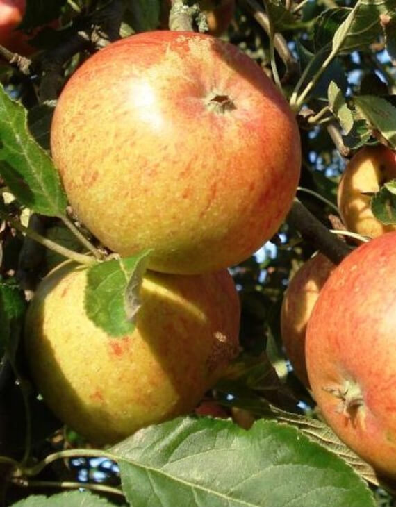 Le Pommier Cox Orange fut introduit dans les années 1830 par un horticulteur anglais, Mr Cox. Elle possède de nombreux synonymes comme : Cos Orange, Reinette Orange de Cox, Cox’s Orangen Reinette. Arborant des feuilles caduques vert vif au printemps et devenant cuivrées en automne, cette variété produit des fruits de calibre moyen, jaune orange strié de rouge.