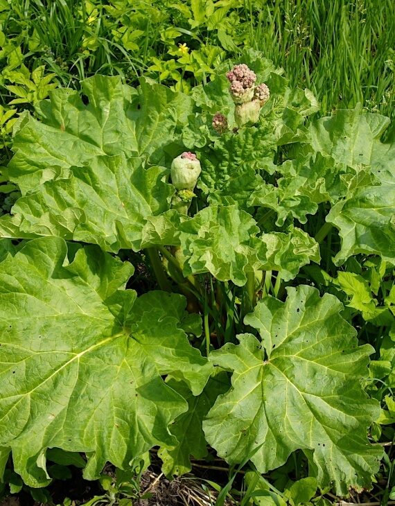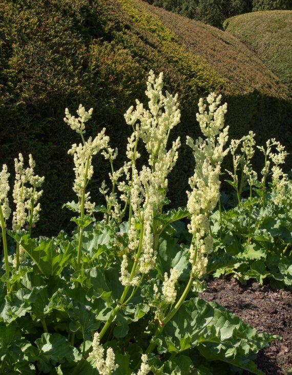En été, cette rhubarbe produit de longues hampes florales dressées, ornées de fleurs blanches à jaunâtres, discrètes mais élégantes, formant des panicules légères et aériennes. Bien que la floraison ne soit pas son principal atout ornemental, elle apporte un certain charme sauvage au jardin.