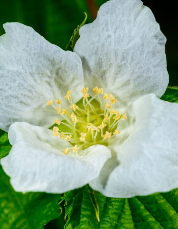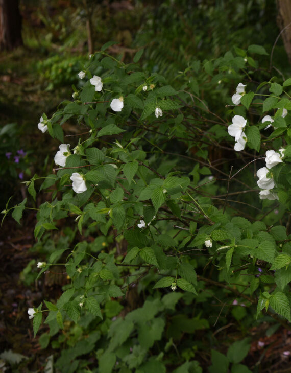 Le Rhodotypos scandens, aussi appelé Rhodotypos blanc, est un arbuste caduc ornemental apprécié pour son feuillage dense, sa floraison délicate et ses fruits décoratifs. Il atteint 1,5 à 2 mètres de hauteur et s’étale sur environ 1,5 mètre, formant un buisson harmonieux. Au printemps et en début d’été, il se couvre de fleurs blanches à quatre pétales, semblables à celles des églantiers, qui contrastent avec son feuillage vert vif.