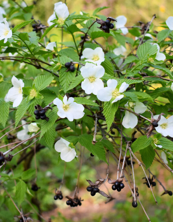 Le Rhodotypos scandens séduit par son port buissonnant, sa floraison élégante et sa grande facilité d’entretien. Très rustique (jusqu’à -25°C), il prospère dans des sols bien drainés et supporte aussi bien la sécheresse que la pollution urbaine. Après la floraison, il produit des baies noires brillantes qui persistent une bonne partie de l’hiver, ajoutant un attrait supplémentaire au jardin et attirant les oiseaux. Son feuillage vert foncé reste décoratif jusqu’à l’automne avant de tomber, laissant apparaître son branchage structuré.