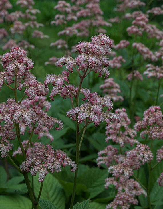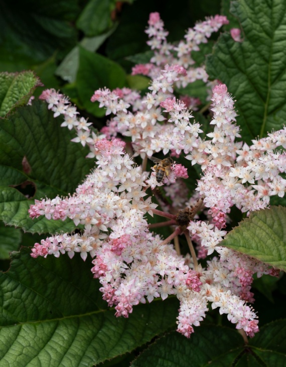 De juin à août, de longues panicules dressées émergent du feuillage. Composées de petites fleurs étoilées, rose tendre à rose foncé selon les cultivars, elles offrent une touche vaporeuse et légère qui contraste magnifiquement avec les feuilles robustes. Ces inflorescences, légèrement parfumées, sont aussi mellifères, attirant abeilles et papillons.