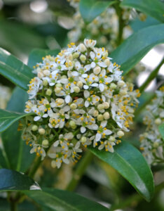 Le Skimmia japonica ‘White’ est un arbuste persistant apprécié pour son feuillage dense et aromatique, ainsi que pour ses inflorescences blanches qui illuminent le jardin en hiver et au printemps. Il atteint 1 à 1,5 mètre de hauteur pour une largeur similaire, formant un buisson compact et arrondi. Dès l’automne, il se couvre de boutons floraux ivoire qui persistent tout l’hiver avant d’éclore en magnifiques grappes de fleurs blanc pur, légèrement parfumées, attirant les pollinisateurs.
