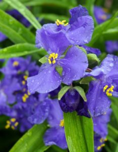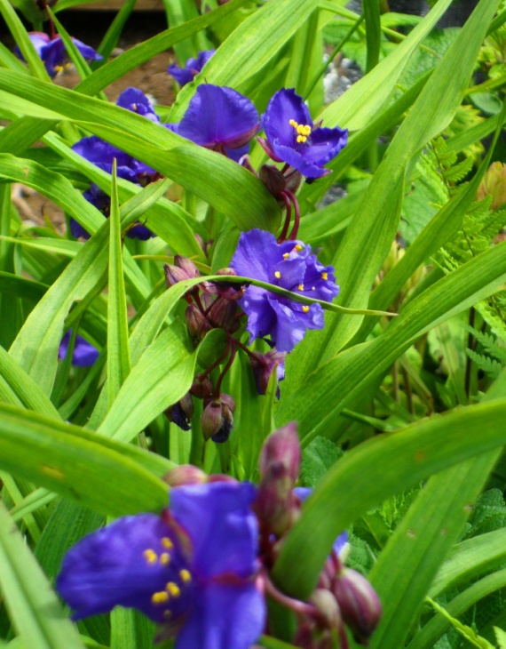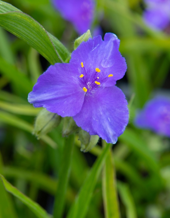 La Tradescantia Zwanenburg Blue se pare de superbes fleurs bleu violacé, chacune durant seulement une journée, mais sans cesse remplacées par de nouvelles tout au long de la saison. Son feuillage vert foncé, linéaire et légèrement arqué, forme une touffe dense et vigoureuse qui structure harmonieusement les compositions végétales.