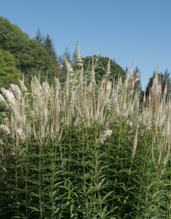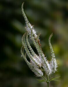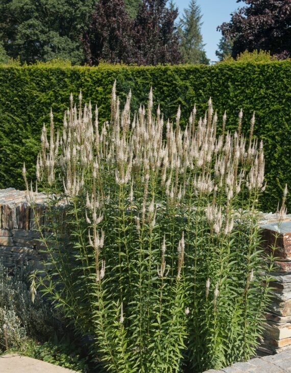 Sa floraison est particulièrement appréciée pour son effet aérien et sa capacité à attirer les pollinisateurs. Elle forme une touffe dense de tiges verticales surmontées de longs épis floraux blanc pur, contrastant joliment avec son feuillage vert foncé lancéolé. Grâce à sa hauteur pouvant atteindre 1,50 m à 2 m, elle constitue un excellent choix pour donner de la verticalité aux massifs et s’associe parfaitement à d’autres vivaces comme les Echinacea, les Phlox ou les graminées ornementales.