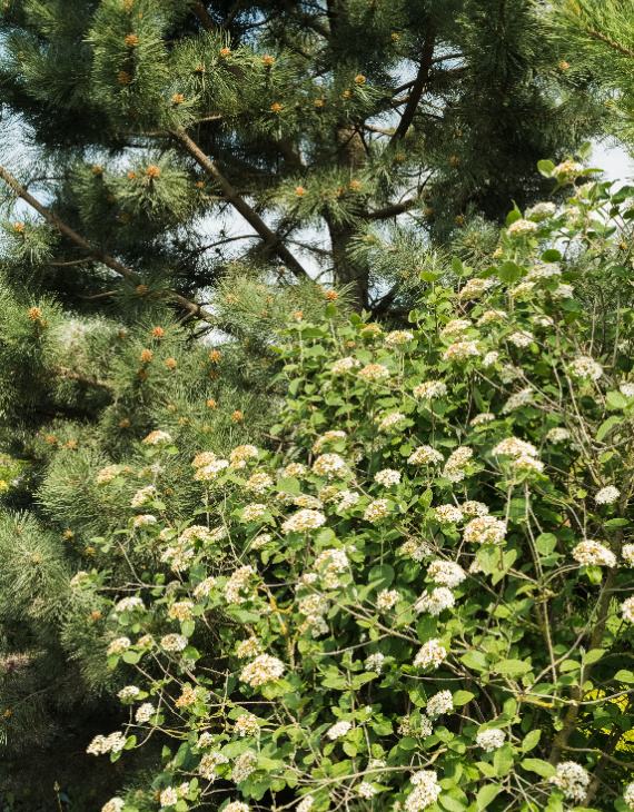 Le Viburnum lantana forme un buisson dense qui peut atteindre 5 mètres de hauteur. Ses grandes feuilles ovales, d’un vert mat, virent au jaune puis au brun rougeâtre en automne, offrant une belle palette de couleurs. Au printemps, ses fleurs blanches, regroupées en larges corymbes, illuminent l’arbuste et diffusent une douce fragrance. En été, les fruits rouges qui deviennent noirs à maturité ajoutent une touche spectaculaire.