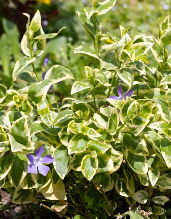 Vinca minor Aureovariegata est une variété remarquable de petite pervenche au feuillage persistant panaché de jaune doré. Ses feuilles ovales vert tendre sont bordées de larges marges dorées, offrant un éclat lumineux au jardin, même en hiver. Sa floraison bleu lavande, qui s’épanouit du printemps à l’automne, contraste joliment avec son feuillage éclatant.