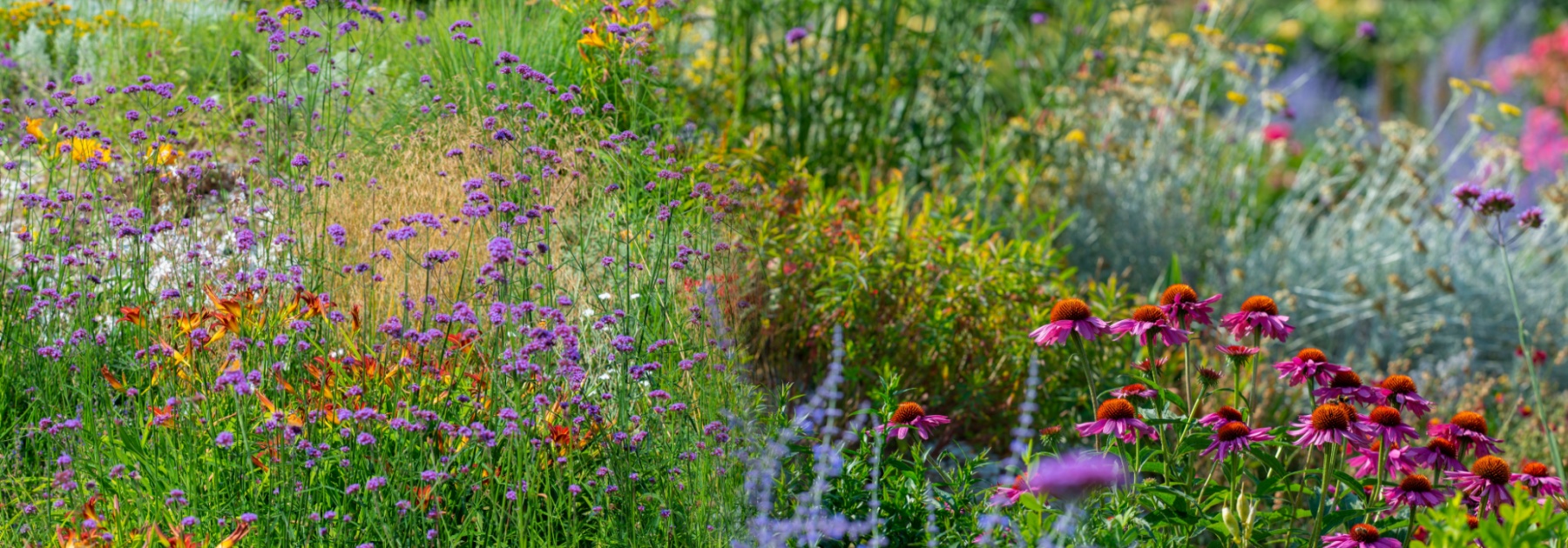 Si vous cherchez des fleurs éclatantes, pensez aux rudbeckias, aux échinacées ou aux géraniums vivaces. Les Verveines de Buenos Aires, mêlées à un ensemble de graminées sont d’un plus bel effet. Leur floraison généreuse attire les pollinisateurs et apporte de la couleur à votre jardin pendant des mois.